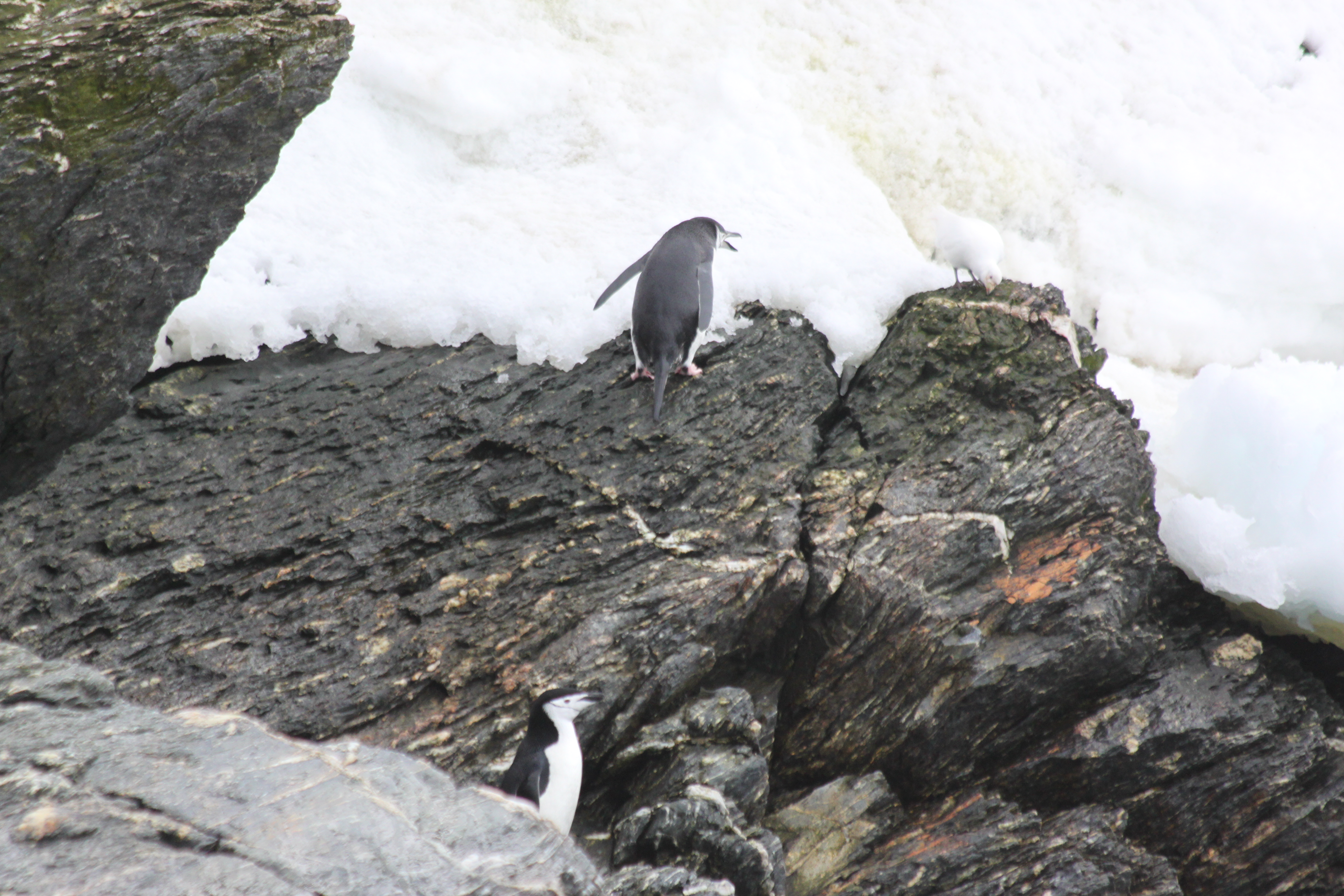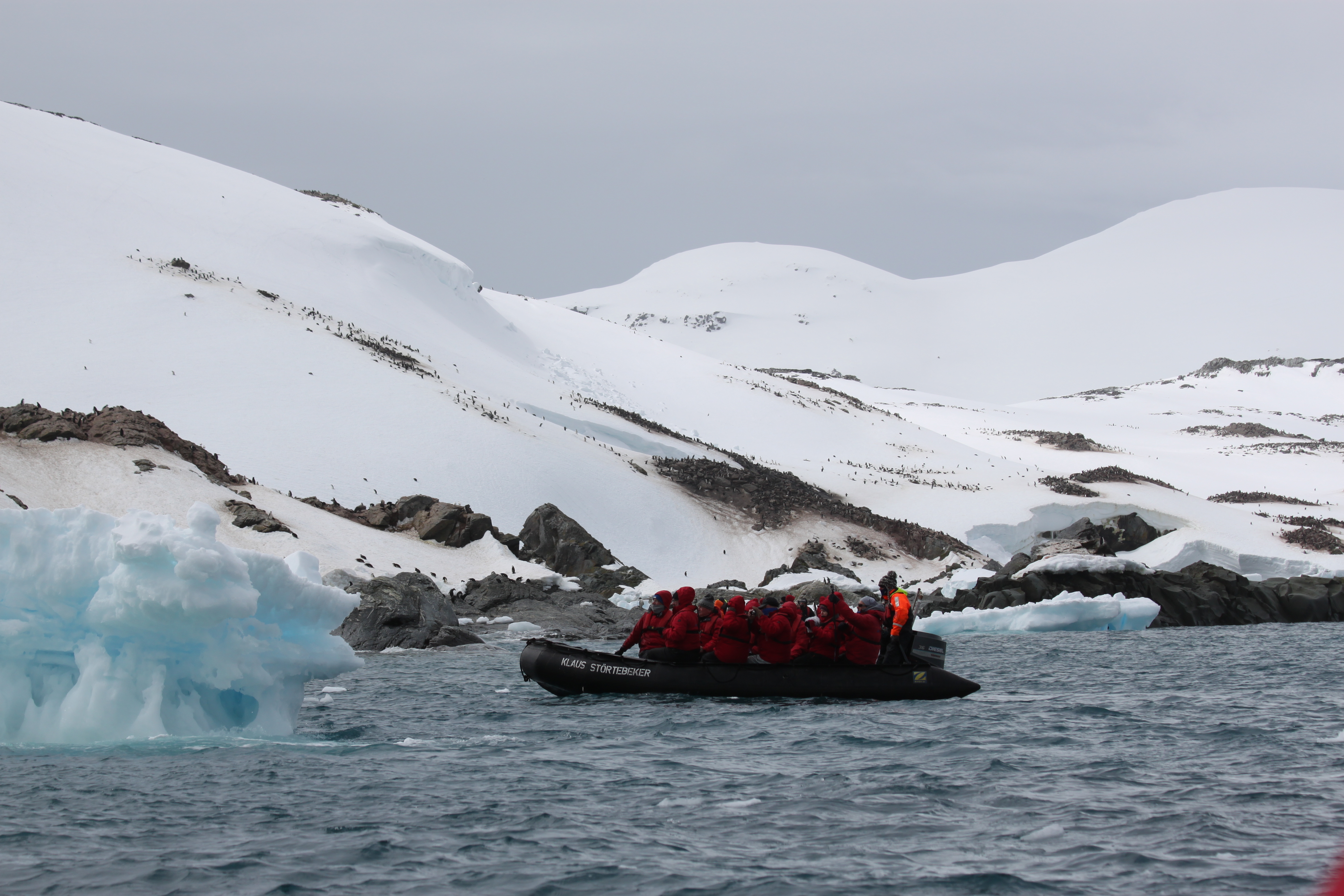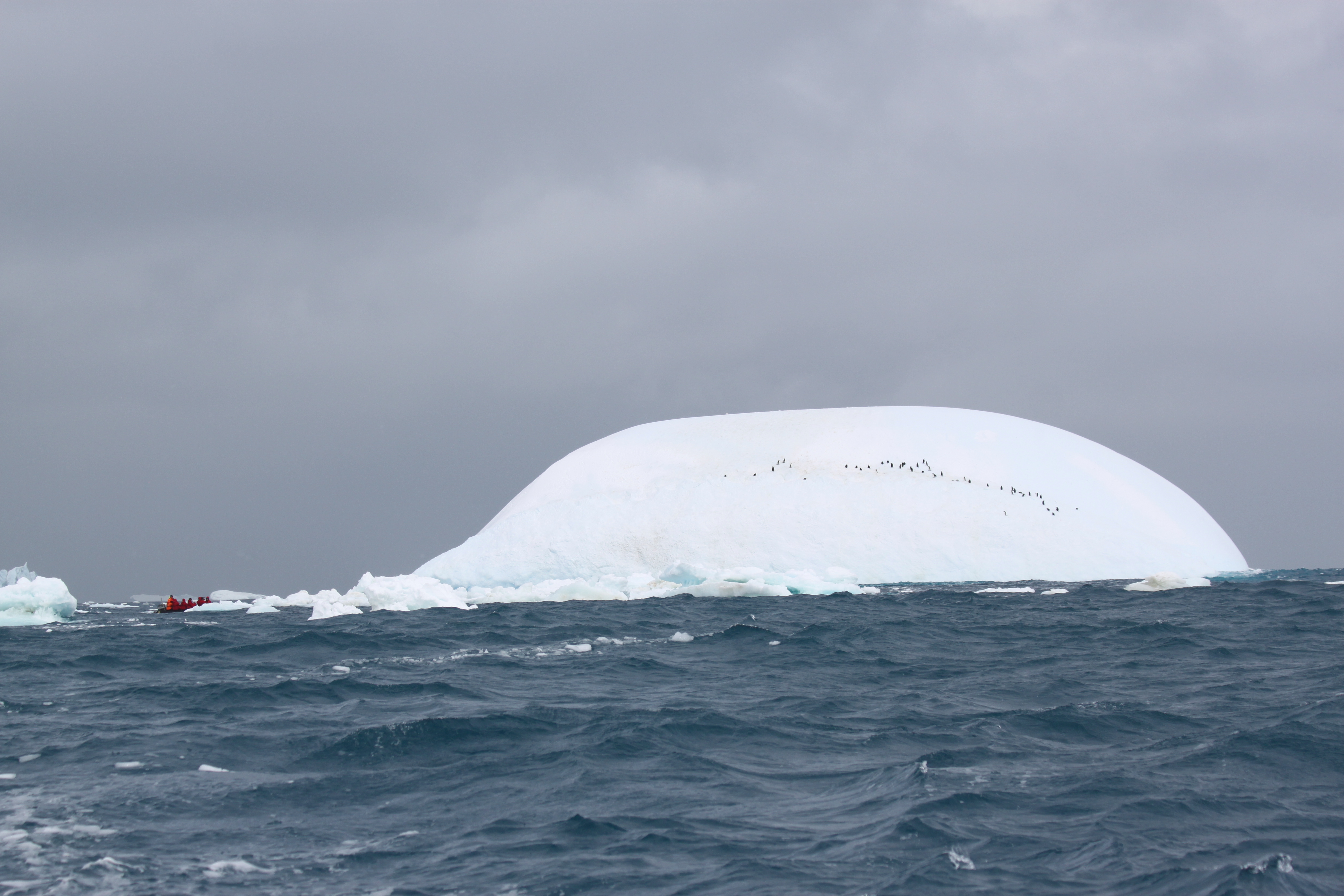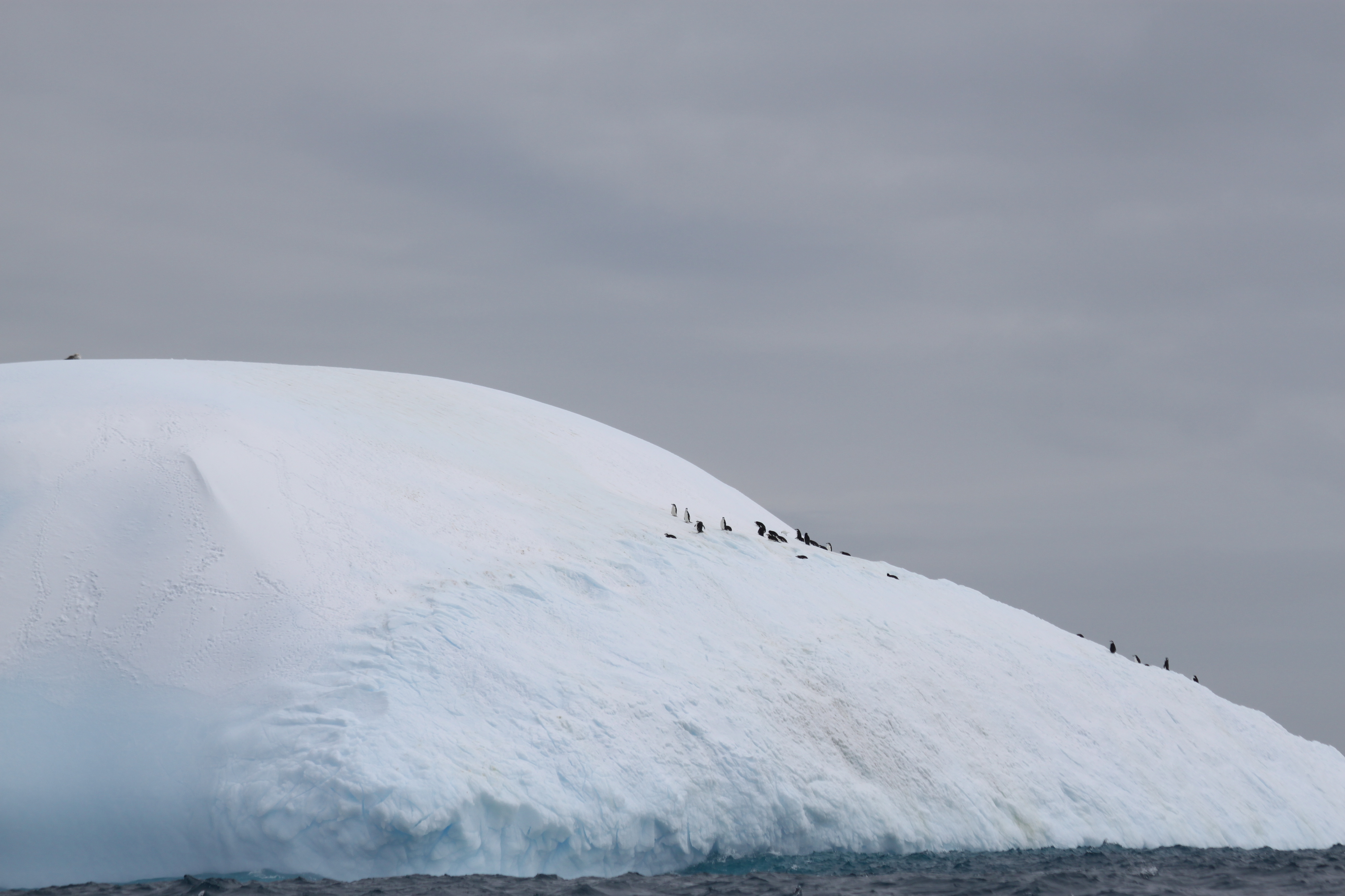 Nach dem Mittagessen geht es «raus»: bei einer Zodiac-Tour vor Monroe Island (benannt nach Nathaniel Palmer’s Schiff «James Monroe») bewundern wir eine grosse Kolonie von Zügelpinguinen. Es ist faszinierend zu sehen, welche Höhen die kleinen Frackträger zu ihren Brutplätzen scheinbar mühelos überwinden. Zahlreiche Eisberge, vom Weddellmeer hierher getrieben, haben sich vor der Insel angesammelt.